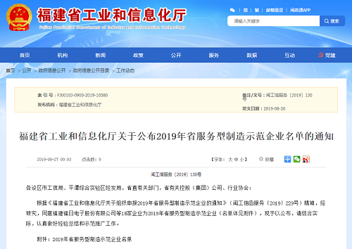 2019年8月26日,福建省工业和信息化厅公布了2019年省服务型制造示范企业名单,福建华体网页版登录界面股份有限公司入选该名单。