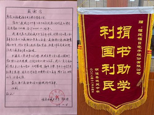 明溪县城关中学寄来的感谢信和锦旗