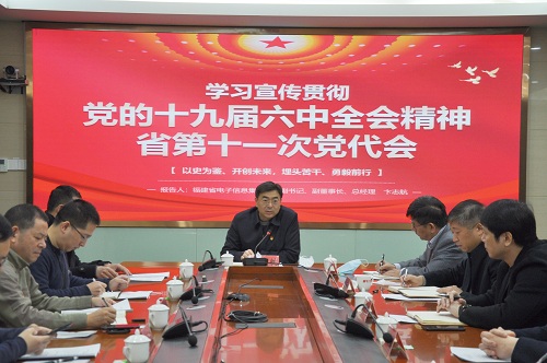 2021年12月31日,福建省电子信息集团党委副书记、副董事长、总经理卞志航到华体网页版登录界面作党的十九届六中全会精神、省第十一次党代会精神专题宣讲。集团相关部室负责人、华体网页版登录界面领导班子成员及各部门负责人等参加宣讲会。